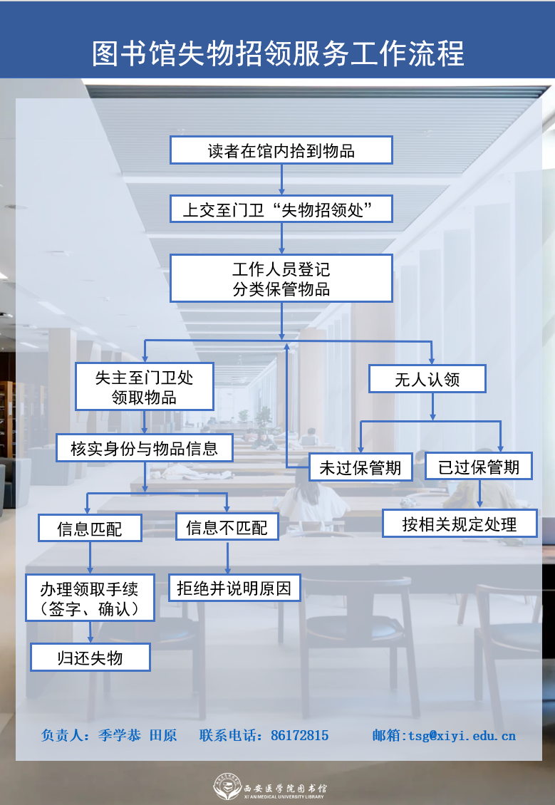查询方式:遗失物品的读者,可在服务时间内,前往一楼大厅门卫“失物招领处”,向门卫工作人员说明物品遗失时间、地点及具体特征,查询是否有匹配的失物登记。