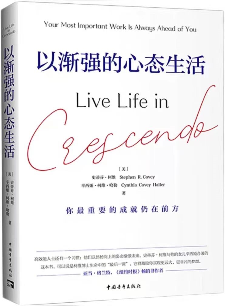 “以渐强的心态生活”意味着一个人在自己能有所贡献的领域中不断成长。“最重要的成就仍在前方”是一种乐观的、有远见的心态,它告诉你无论发生过什么、无论你处于哪个阶段,你都可以做出贡献。就像音乐是建立在之前演奏或演唱的音符之上,却总会让我们对下一个音符、和弦充满期待。你的生活建立在你的过去之上,但是未来更值得期待。这本书是柯维博士去世前几年就想要写的一本书,当时他就邀请了他的大女儿辛西娅和他一起完成。他之所以想到这样一个书名是因为:他认为,“渐强心态”可以使人在各个阶段、各个年龄段都能保持向前看、不断进步的姿态。他坚信理想的“以终为始”就是不断地为他人的福祉做出有意义的贡献。这种渐强心态是获得真正持久幸福的关键。在写这本书之前,他已在个人演讲中介绍过这个原则,这是他的工作模式。在晚年的时候,“渐强”原则成为了柯维博士的个人使命宣言。柯维博士笃信,如果人们在生活中运用“渐强心态”,就会对周围、对他人乃至整个世界产生巨大且深远的影响。