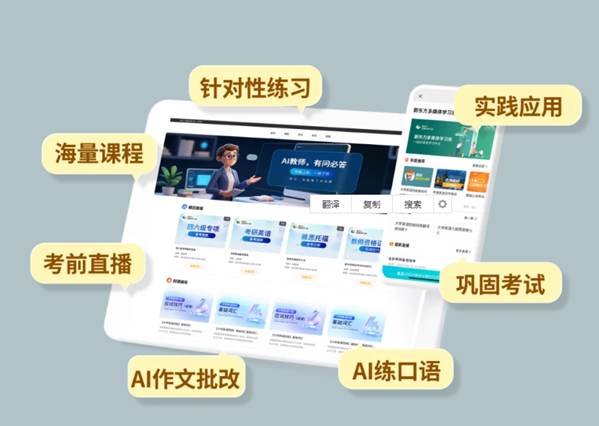 四六级考试冲刺已进入关键阶段,选择专业的备考工具能让努力更有方向。新东方多媒体学习库以「核心课程打基础、考试中心练实战、互动直播解难点、资讯板块掌动态、AI批改提写作」五大板块为支撑,为考生提供全周期、系统化、个性化的备考解决方案,助你高效突破难点,成功过级!