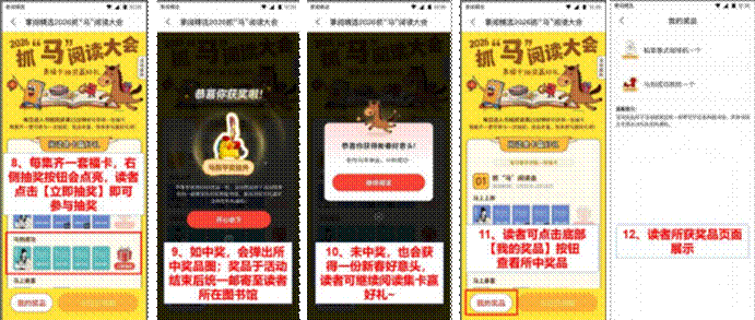 读者每日进入书城阅读任意电子书满15分钟即可获得一张马年好意头福卡,每集齐一套福卡即可参与一次抽奖。活动期间共设置六套福卡,读者最多可获得六次抽奖机会。