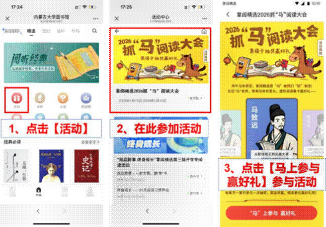 进入主页,点击【活动】进入活动专区,找到2026抓“马”阅读大会活动进入活动主页,点击底部【“马”上参与赢好礼】按钮即可参与活动。