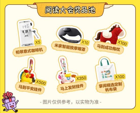 本次活动抽奖奖池共设置1000+份奖品,奖品内容如下:柏翠意式咖啡机5台,米家智能按摩眼罩10份,马到成功抱枕100份,马到平安挂件500份,马上发财挂件350份,掌阅精选定制帆布袋100份,掌阅精选定制文件袋45份。