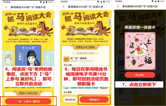 迎马年,真抓“马”!掌阅精选特别策划2026抓“马”阅读大会活动,将5位与马相关的中国古代名人“抓”到本场活动中,与读者分享其精彩的人生故事,每位名人故事也引伸出一个马年好意头。读者阅读达标即可领取好意头福卡,集齐一套福卡即可抽奖赢马年好礼。