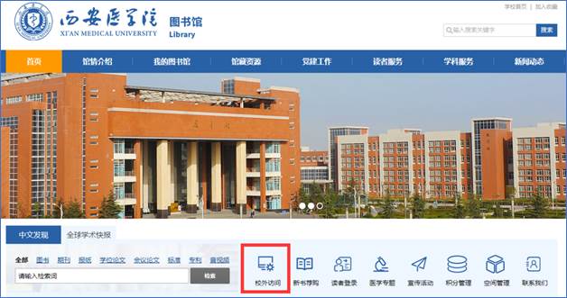 进入图书馆首页,点击校外访问,如下图所示: