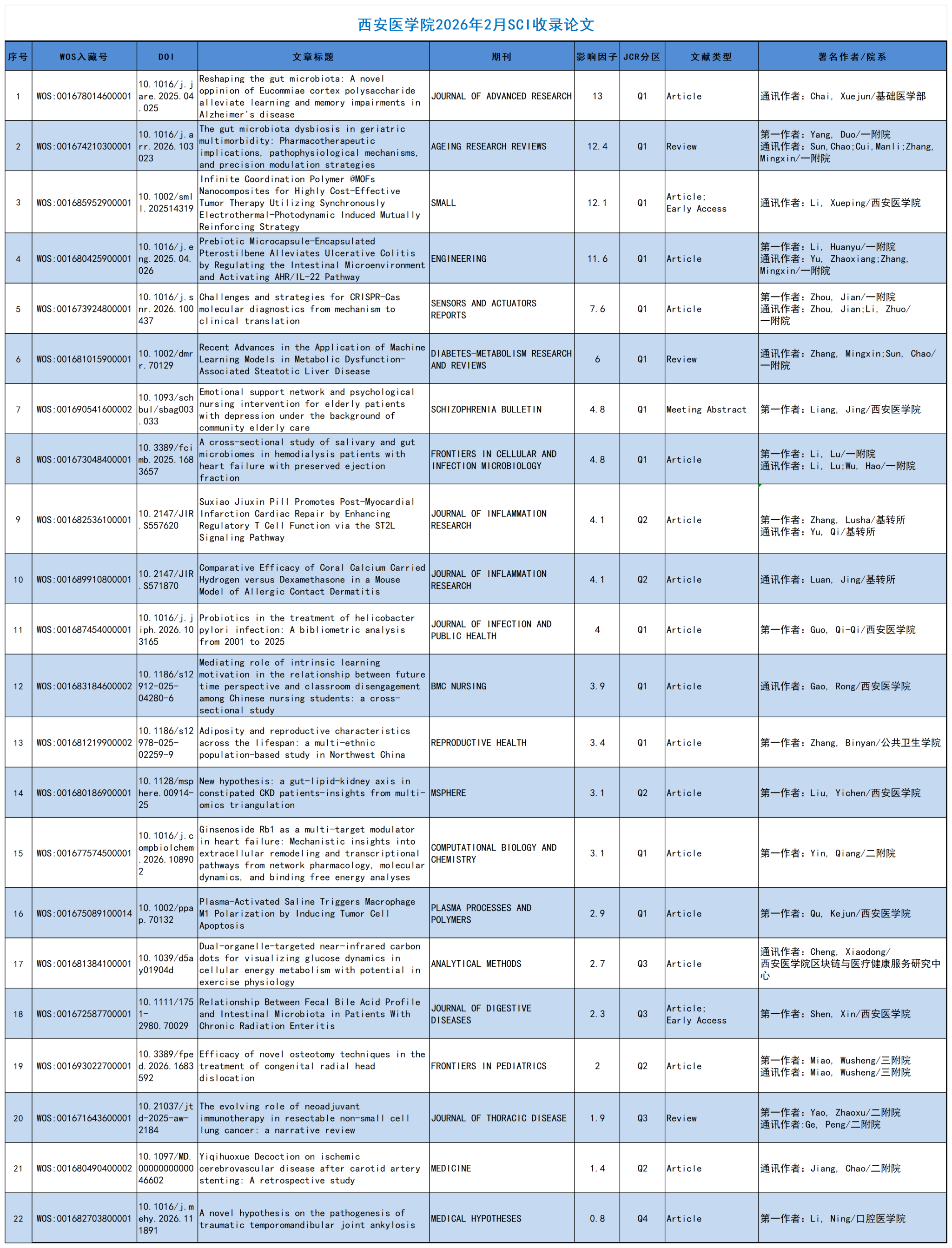 2026年2月,Web of Science核心合集收录以我校作为第一作者或通讯作者署名单位的论文共22篇,其中研究论文(Article)18篇、综述(Review)3篇及会议摘要(Meeting Abstract)1篇,以下为论文详细信息。