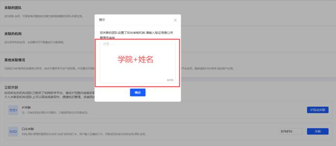 (3)两种方式点击关联后,均需在申请中填写“学院+姓名”后提交,图书馆在收到信息后审核通过。为保障我校师生权益,未填写信息的将不予通过。