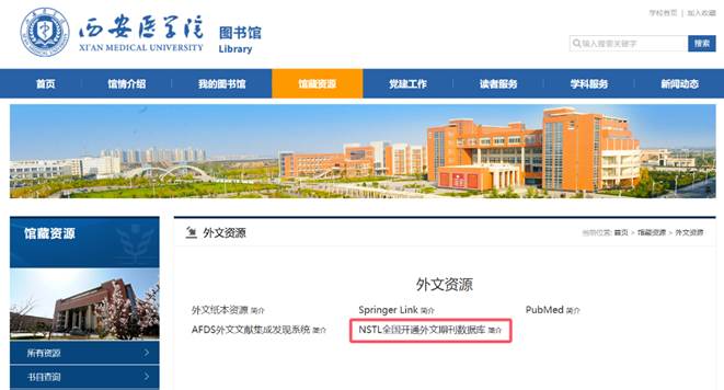 访问路径:登录图书馆网站——馆藏资源——外文资源——NSTL全国开通外文期刊数据库,即可直接访问。