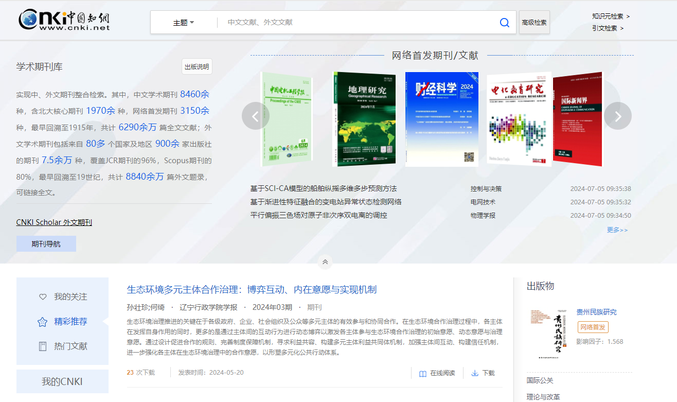 CNKI可实现中、外文期刊整合检索,读者可以在中国知网学术期刊数据库用一框式检索、高级检索、专业检索等多种检索方式进行期刊查询,同时,读者可以方便地阅读统一主题下的中外文文献。该库默认的检索结果包含知网合作的国外期刊题录数据,只有“中文文献”分组项内的条目是本库全文数据。