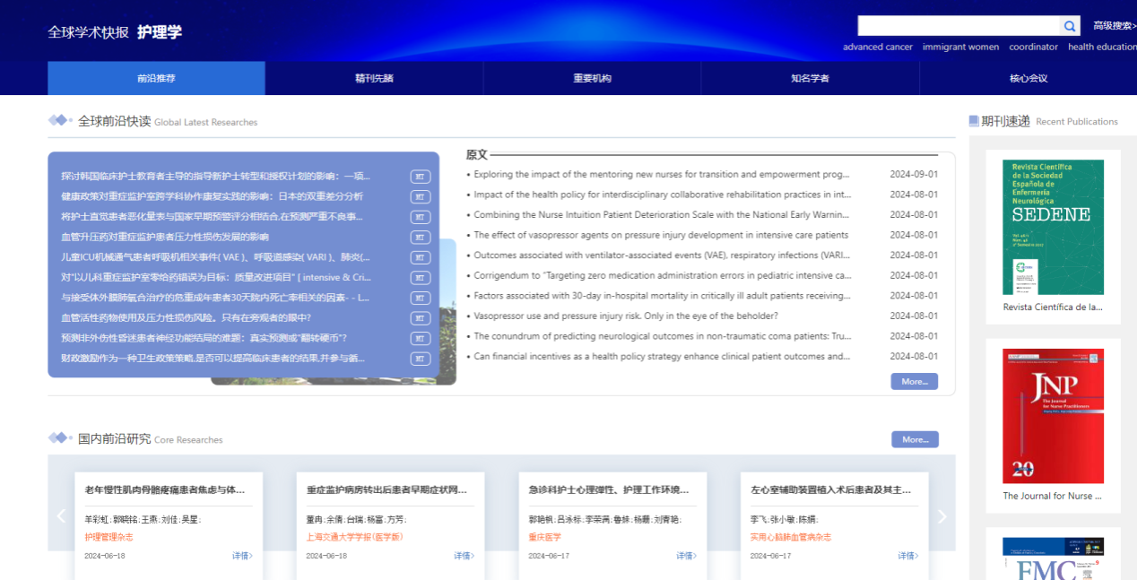 “全球学术快报护理学”平台是中国知网在世界知识大数据的基础上,依托总库智能检索平台,按照世界一流护理学学科建设需求搭建的全球学术资源统一发现和实时推送的服务平台。该平台全面覆盖世界一流护理学学科的全球优质学术期刊,实时追踪学科领域内核心刊、新刊、专业学协会、权威机构、学者和会议的最新研究成果,及时报道世界一流学科最新学术前沿动态,配合知网智能检索与智能翻译技术,让读者快速发现并读取最新和最相关的高质量文献。实时追踪最新研究成果,及时了解前沿学术动态,满足研究人员及时、准确、全面地获取领域内前沿学科信息的需求。